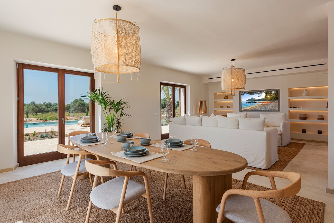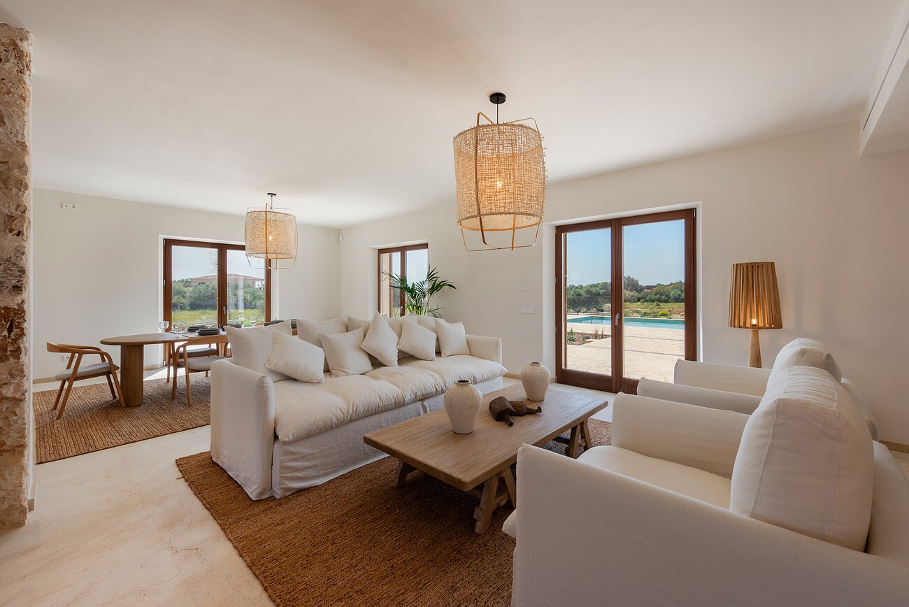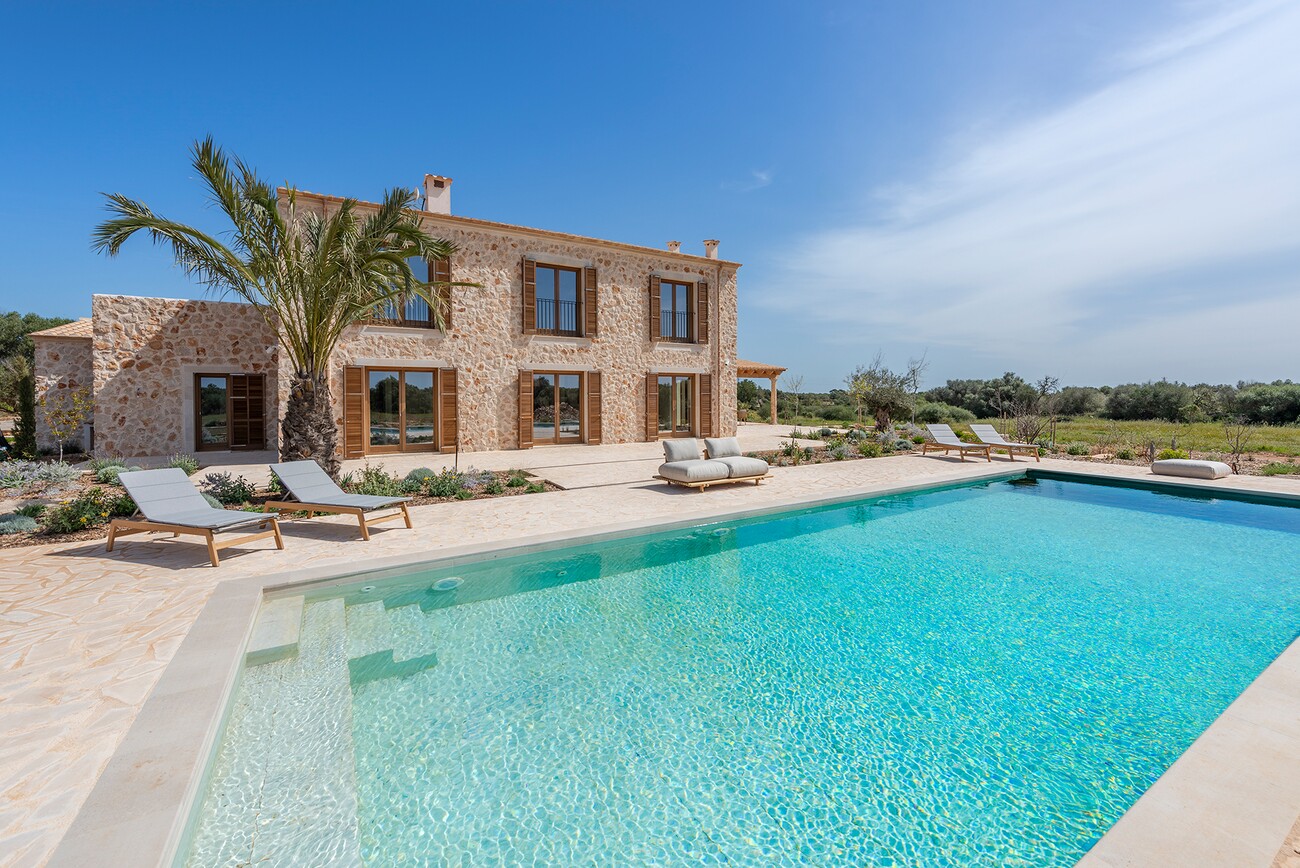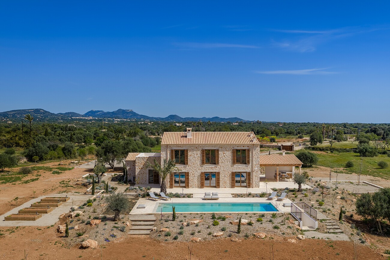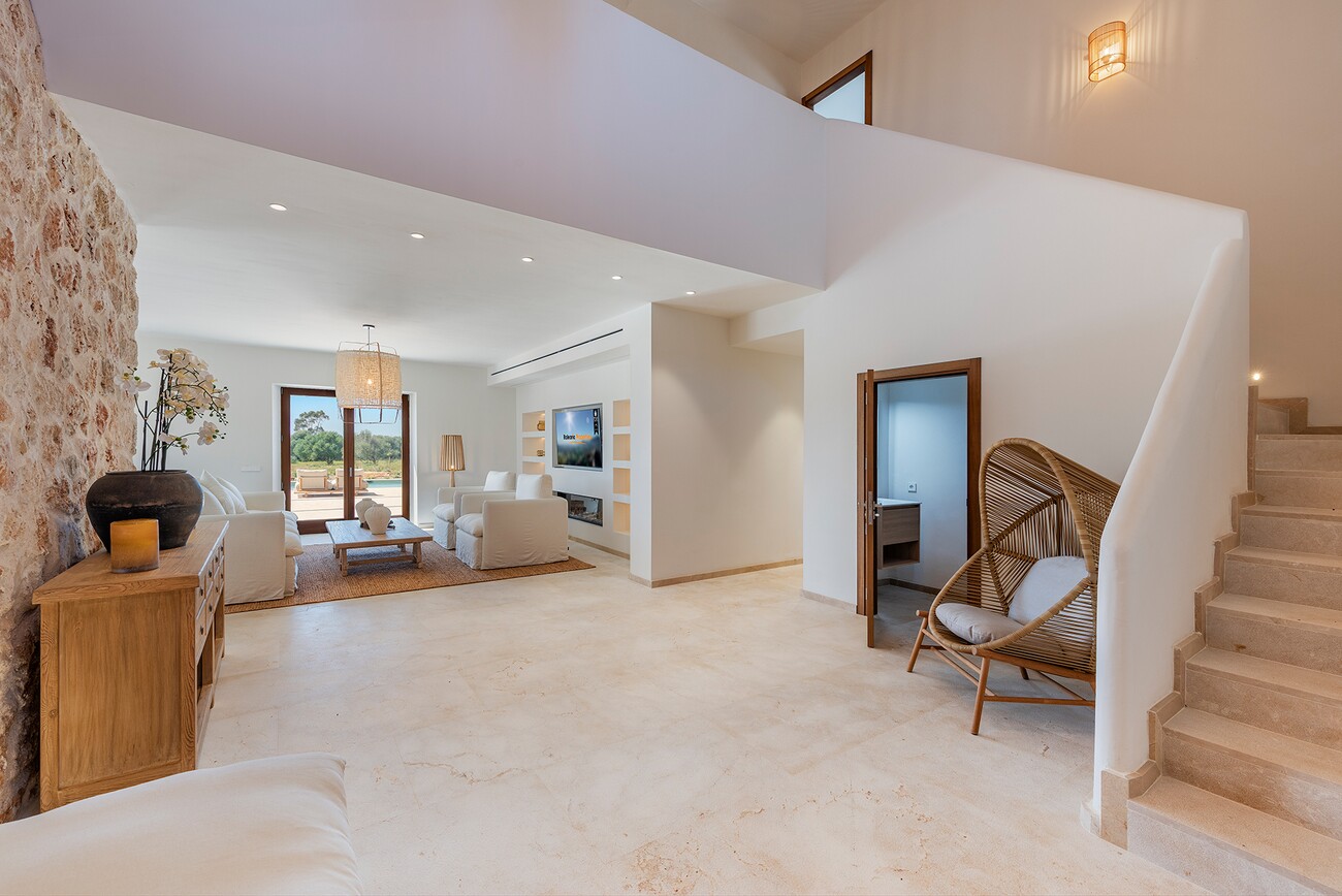 This elegant natural stone finca is reached via a long driveway, revealing a classic Mallorcan façade that conceals an unexpectedly bright modern interior. The design uses natural materials such as wood and stone, along with matching architectural details, and features high-quality materials like marble, teak wood, and Santanyi stone.