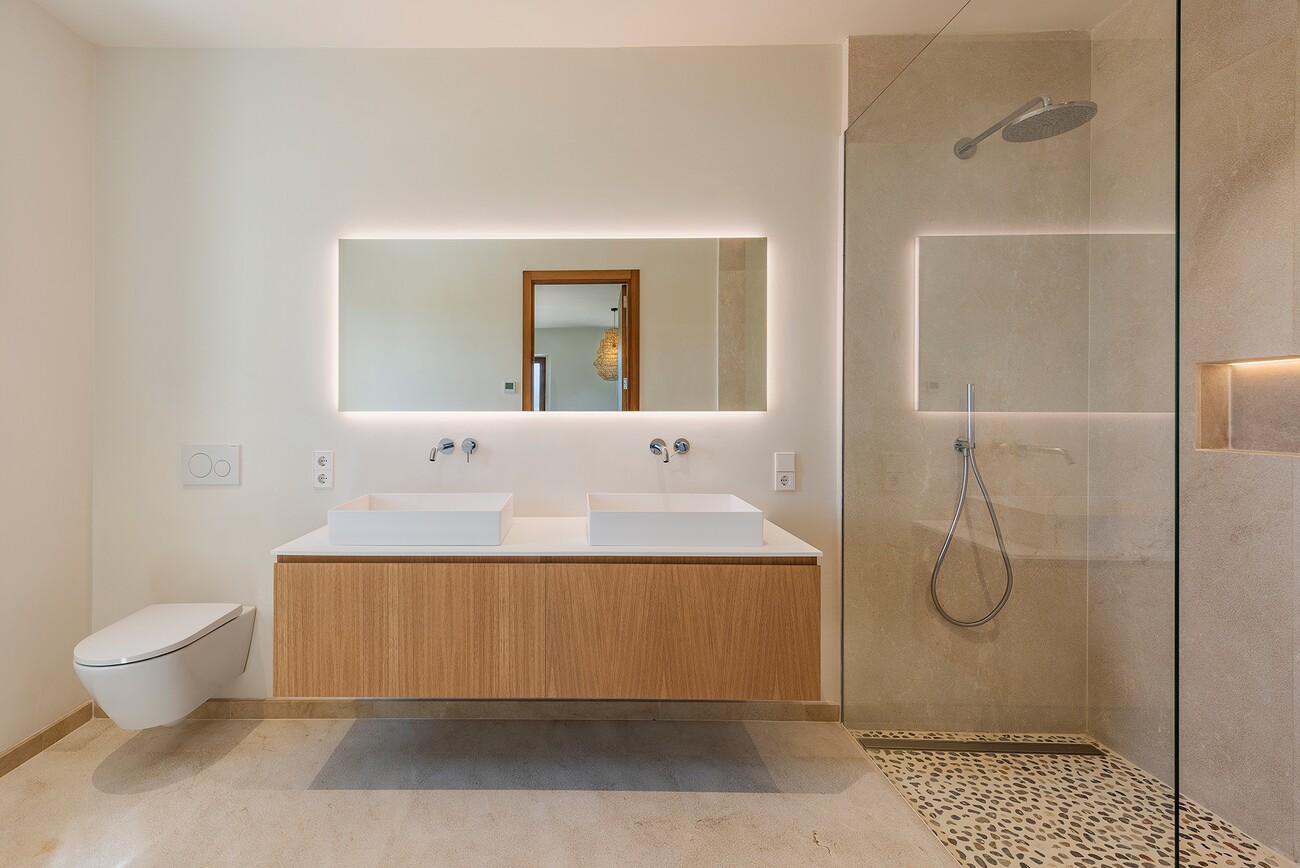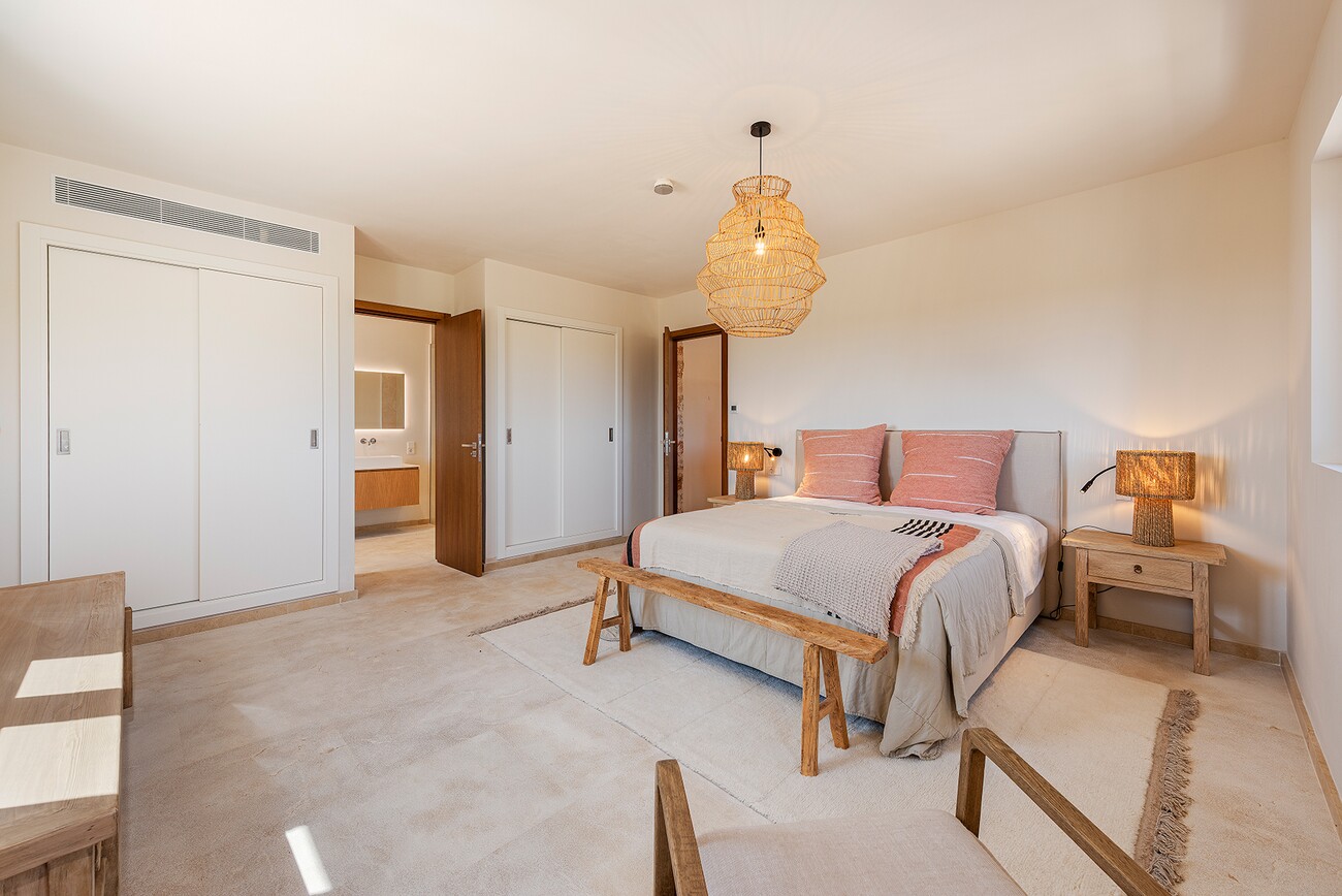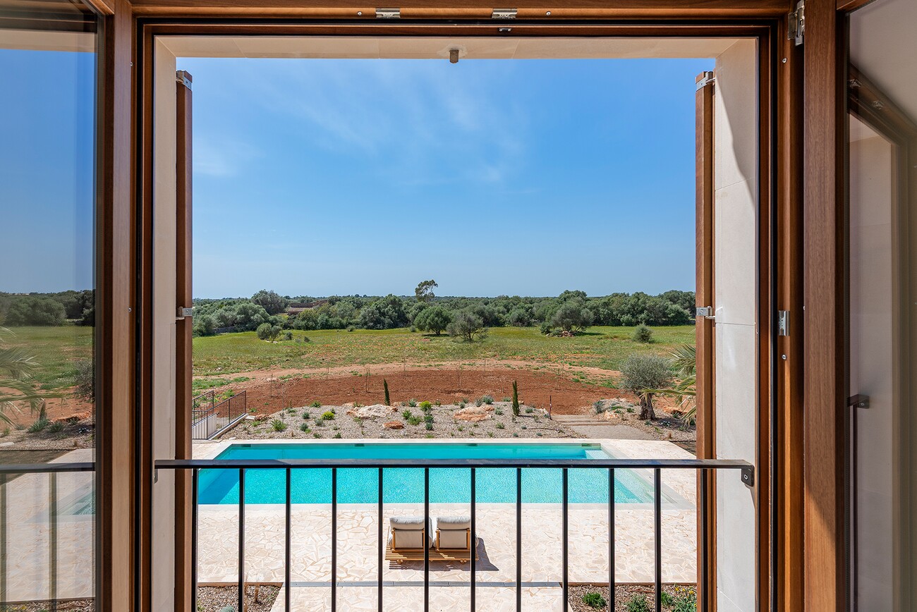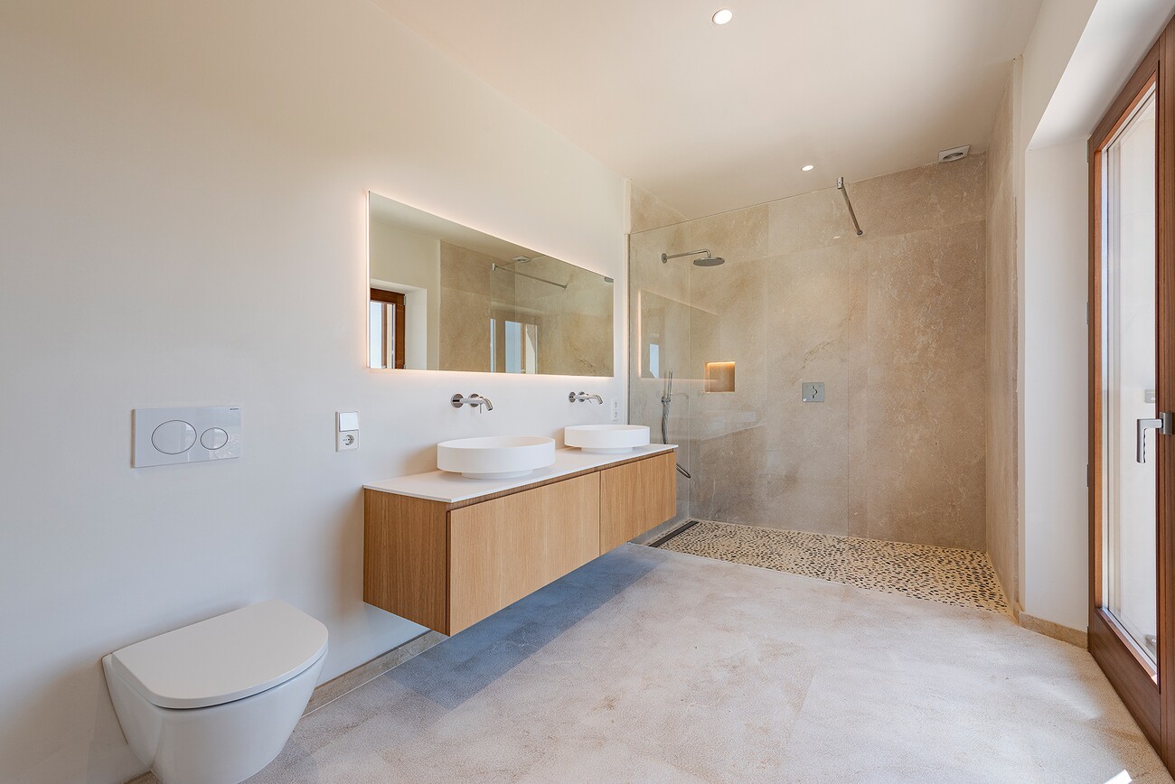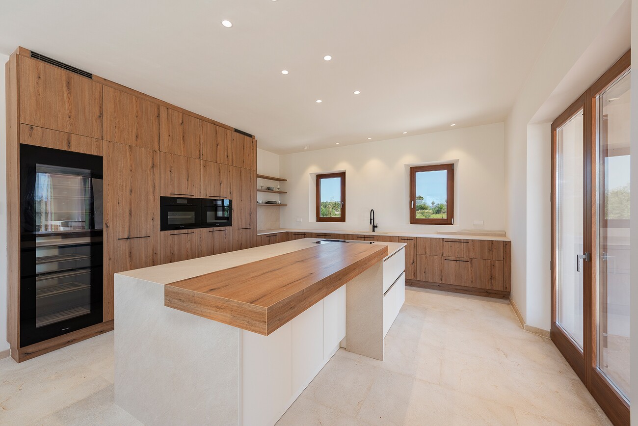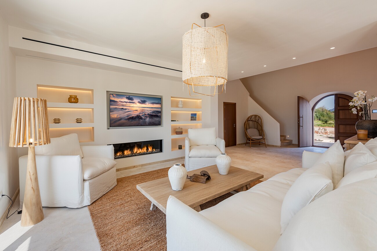This elegant natural stone finca is reached via a long driveway, revealing a classic Mallorcan façade that conceals an unexpectedly bright modern interior. The design uses natural materials such as wood and stone, along with matching architectural details, and features high-quality materials like marble, teak wood, and Santanyi stone.