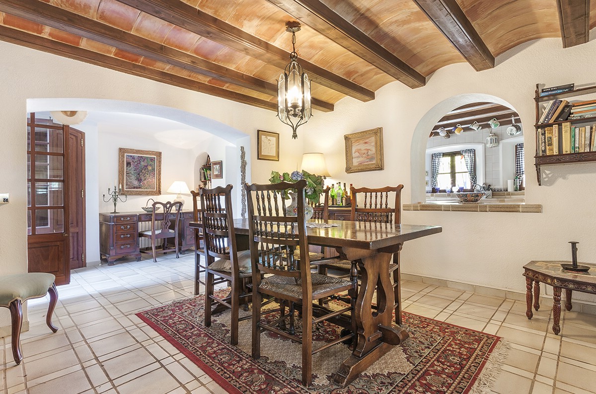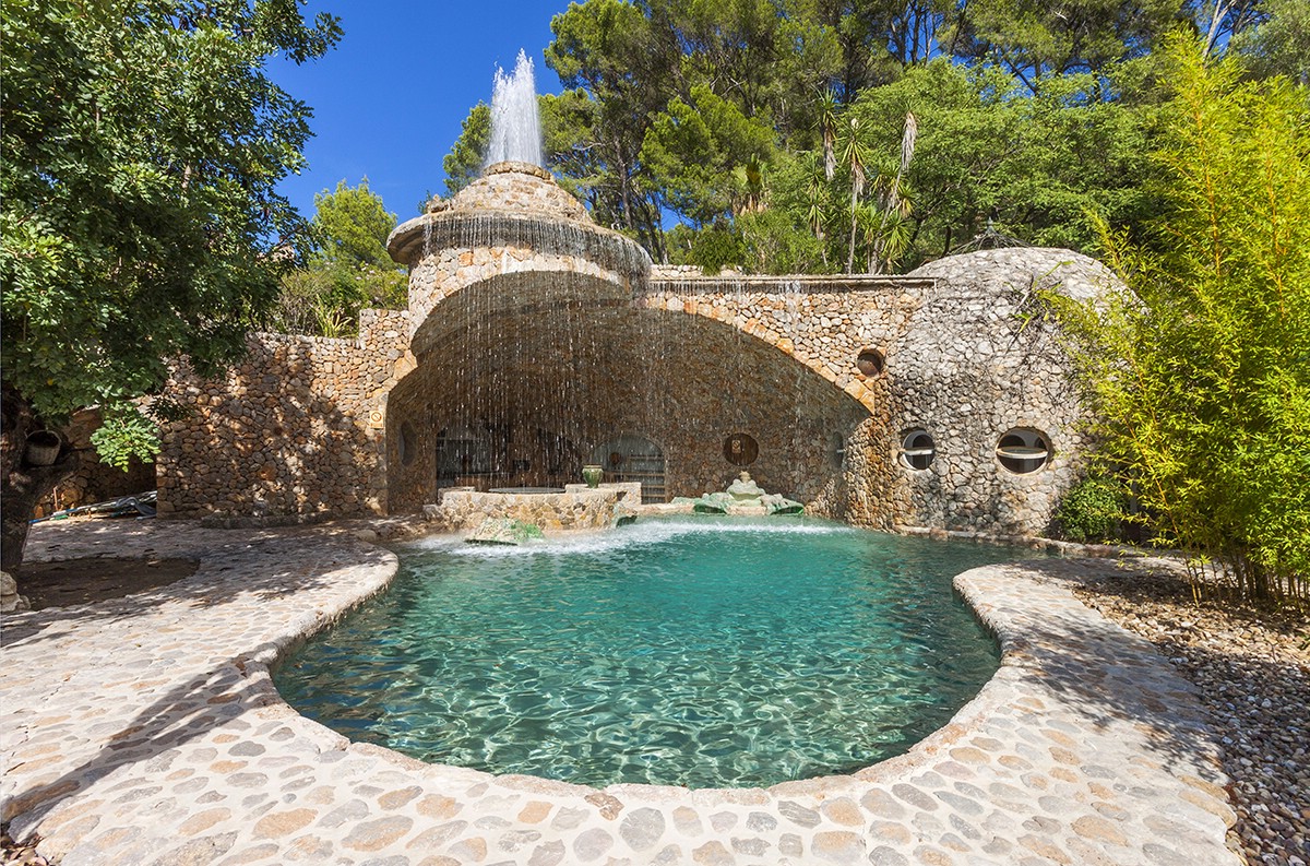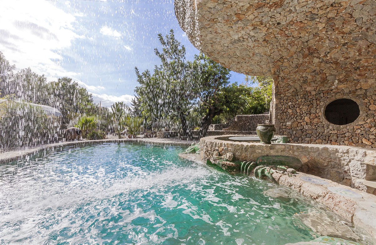 De fantastische buitenruimte lijkt op een SPA met zwembad en romantische waterval , een volledig uitgeruste buitenkeuken met Mallorcaanse broodoven en een BBQ-ruimte met een bar en een eigen eethoek.