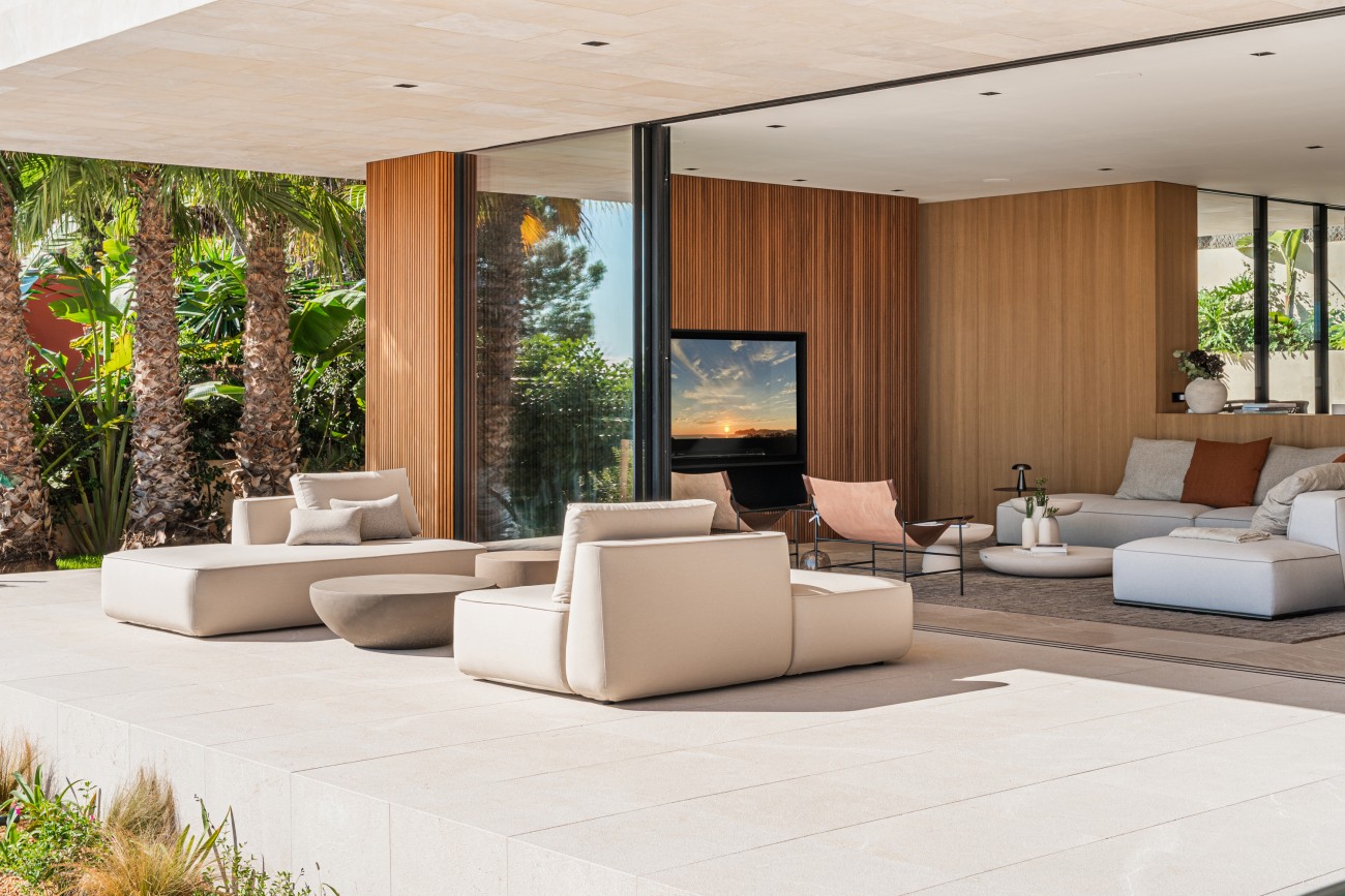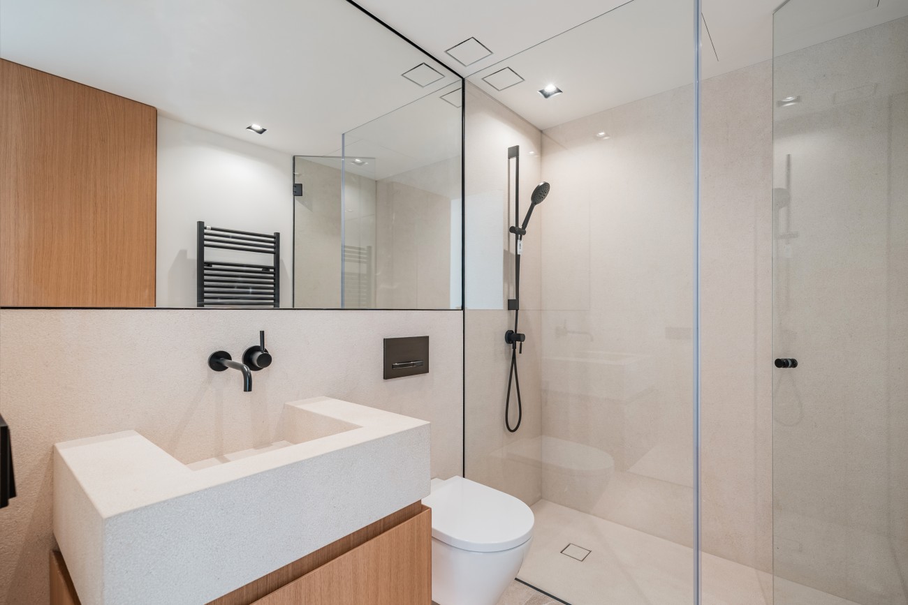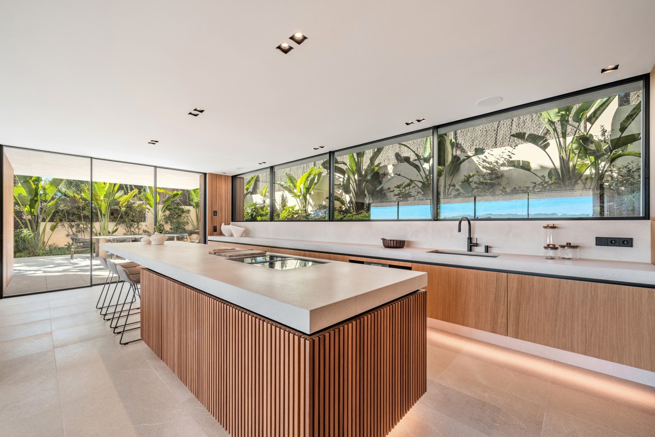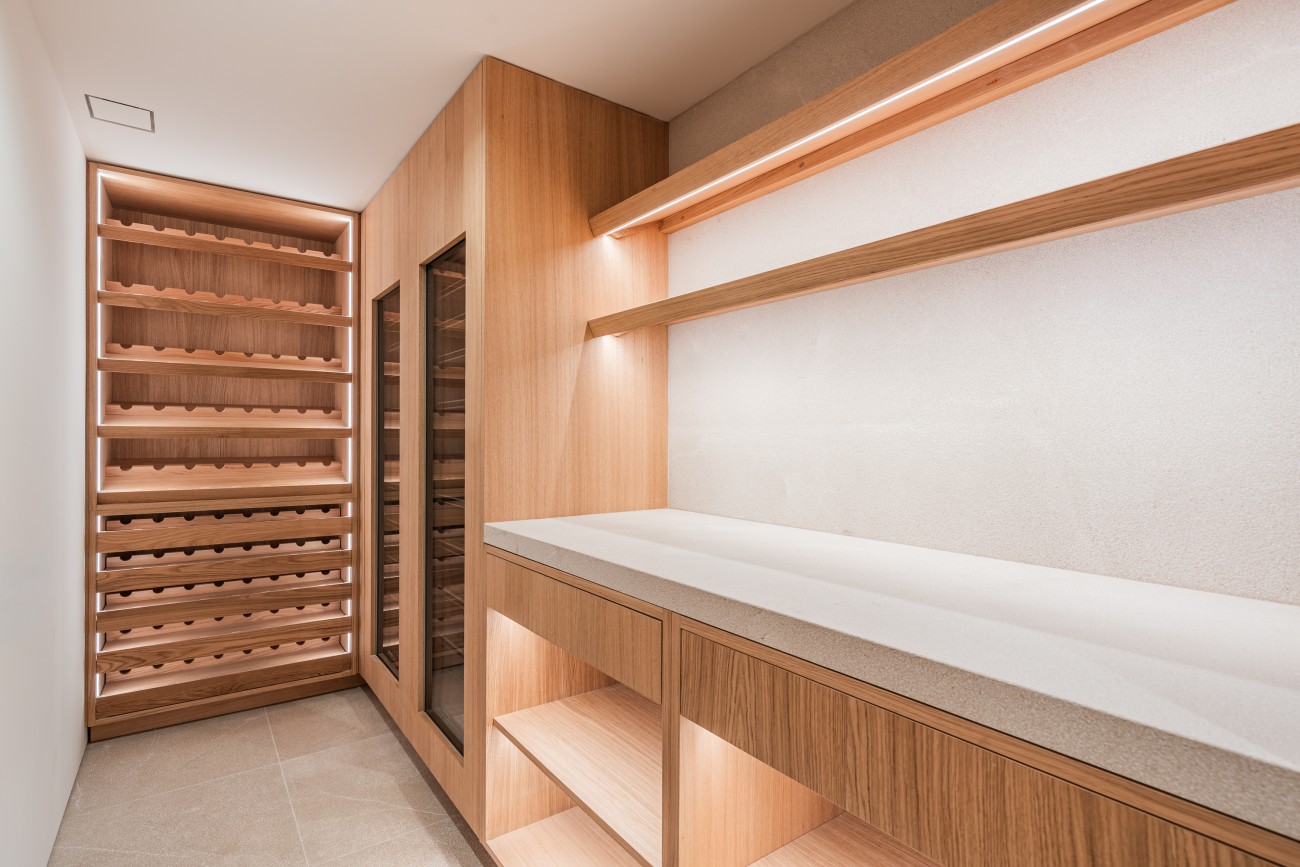 Verdeeld over twee verdiepingen en verbonden door een lift van de kelder naar de bovenverdieping, beschikt de villa over vier ruime slaapkamers, vijf badkamers en een gastentoilet. De open keuken is volledig uitgerust met hoogwaardige Bora- en Miele-apparatuur en is naadloos geïntegreerd in de woon- en eetgedeeltes. Een verwarmd zoutwaterzwembad van 59 m², vloerverwarming en airconditioning aangedreven door aerothermische energie zorgen het hele jaar door voor comfort. De woning beschikt ook over een garage voor vier auto’s met voldoende opslagruimte en aluminium ramen met dubbele beglazing voor optimale isolatie.