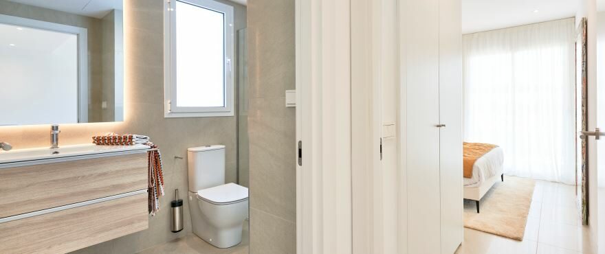 This stunning Mediterranean-style development offers the final three 2-bedroom apartments for sale in the heart of Cala d’Or. Featuring a classic white colour palette and surrounded by spacious gardens with native plants, these homes provide a peaceful retreat with access to two communal swimming pools.