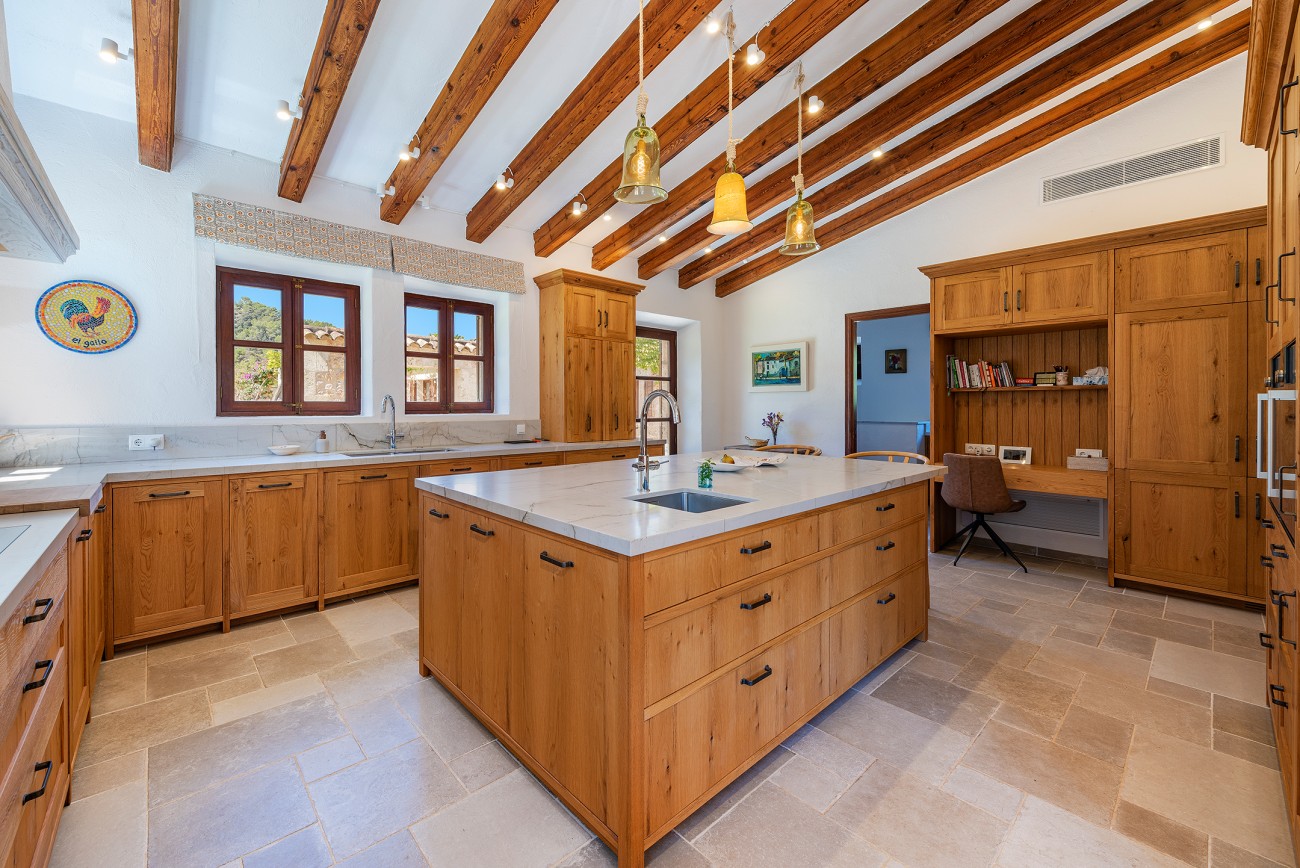 Het hoofdgebouw heeft 3 slaapkamers met eigen badkamer en een garderobe. De hoofdslaapkamer met kleedkamer en grote badkamer beslaat de hele eerste verdieping en heeft balkons op het noorden en zuiden die toegankelijk zijn via openslaande deuren. De keuken is een perfecte mix van voornamelijk verborgen Gaggenau apparatuur met kwarts werkbladen en rustieke houten eenheden. Er zijn 3 spoelbakken met kranen voor kokend, gekoeld en bruisend water. Toegang tot de wijn-/olijfolieruimte van de bodega. Toegang tot het overdekte zuidterras om buiten te eten. De woon- en eetkamer hebben openslaande deuren naar de overdekte terrassen op het noorden en zuiden.