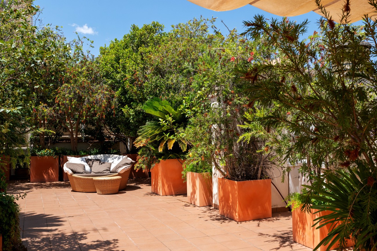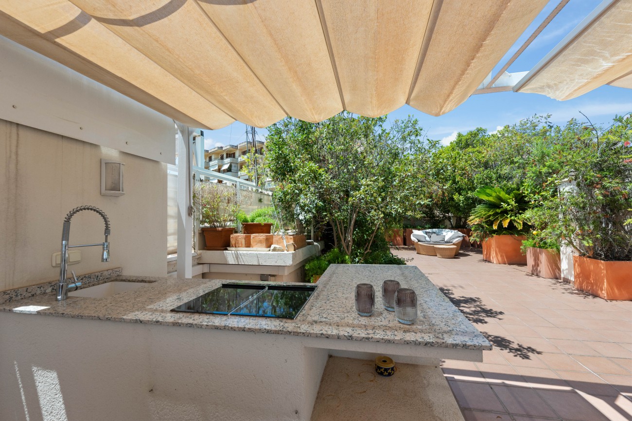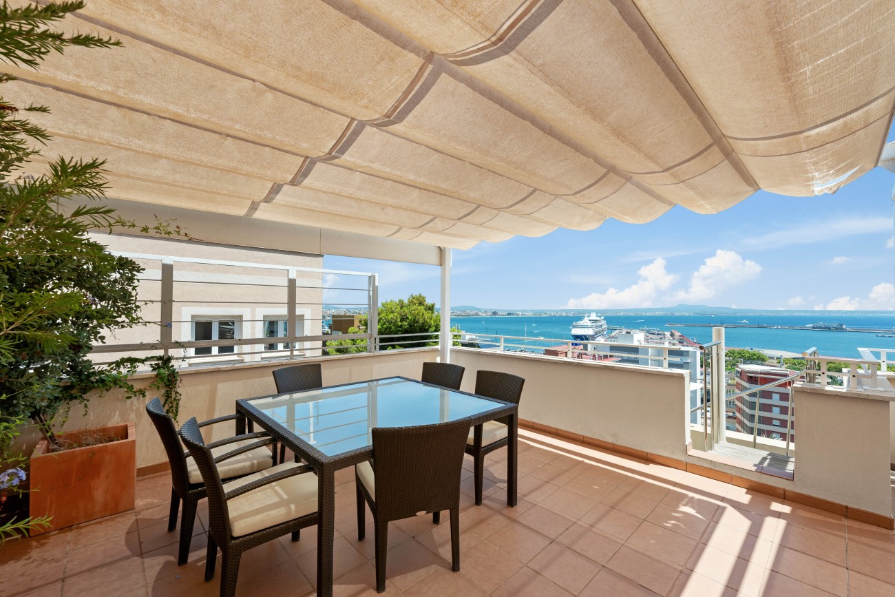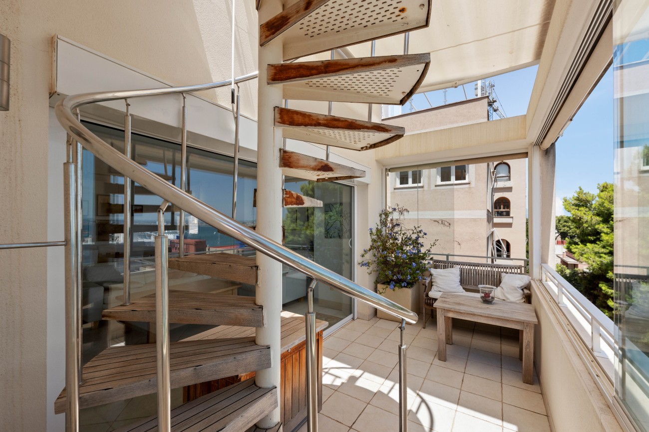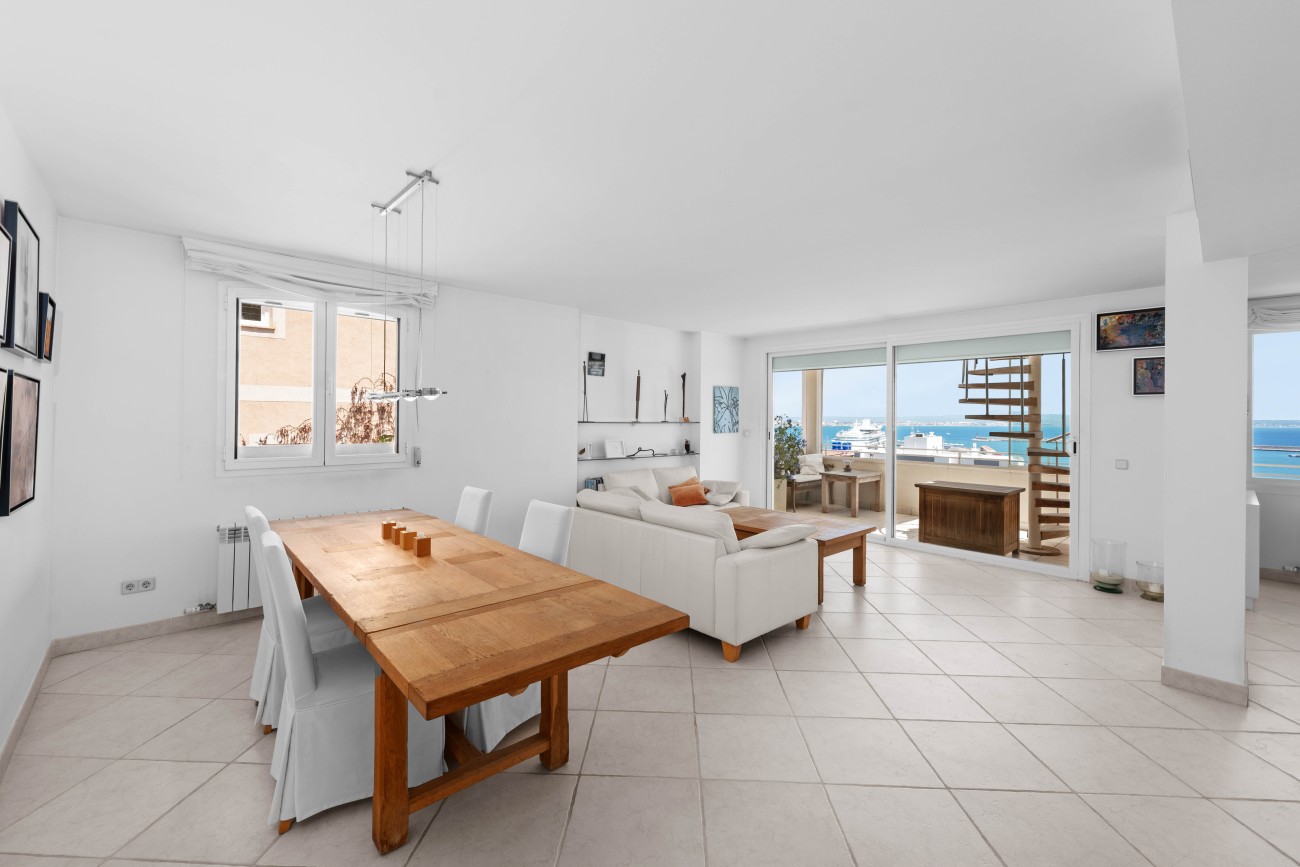 A highlight is the private roof terrace, also measuring around 100 m². From here, enjoy breathtaking 360-degree views over Palma’s skyline, the Bay of Palma, the port, and the landmark La Seu Cathedral. This exclusive outdoor space offers a rare opportunity to take in the beauty of the city and sea from an elevated and private perspective.