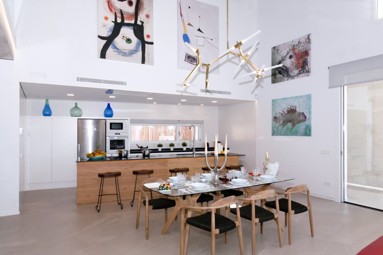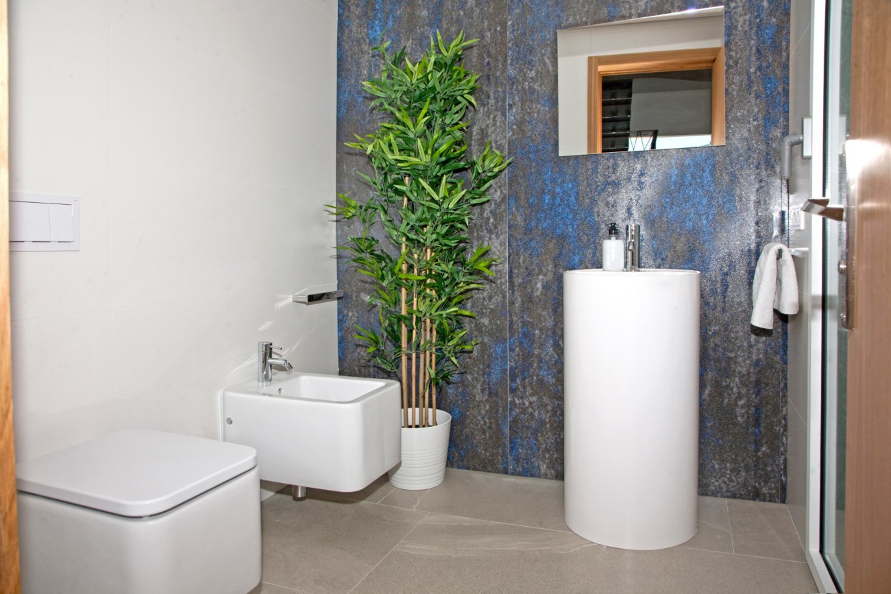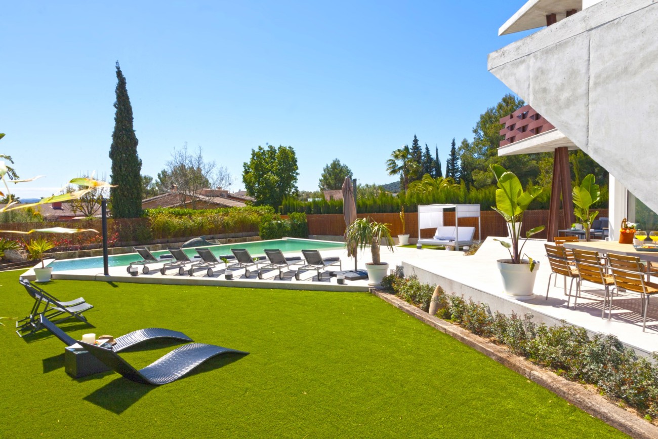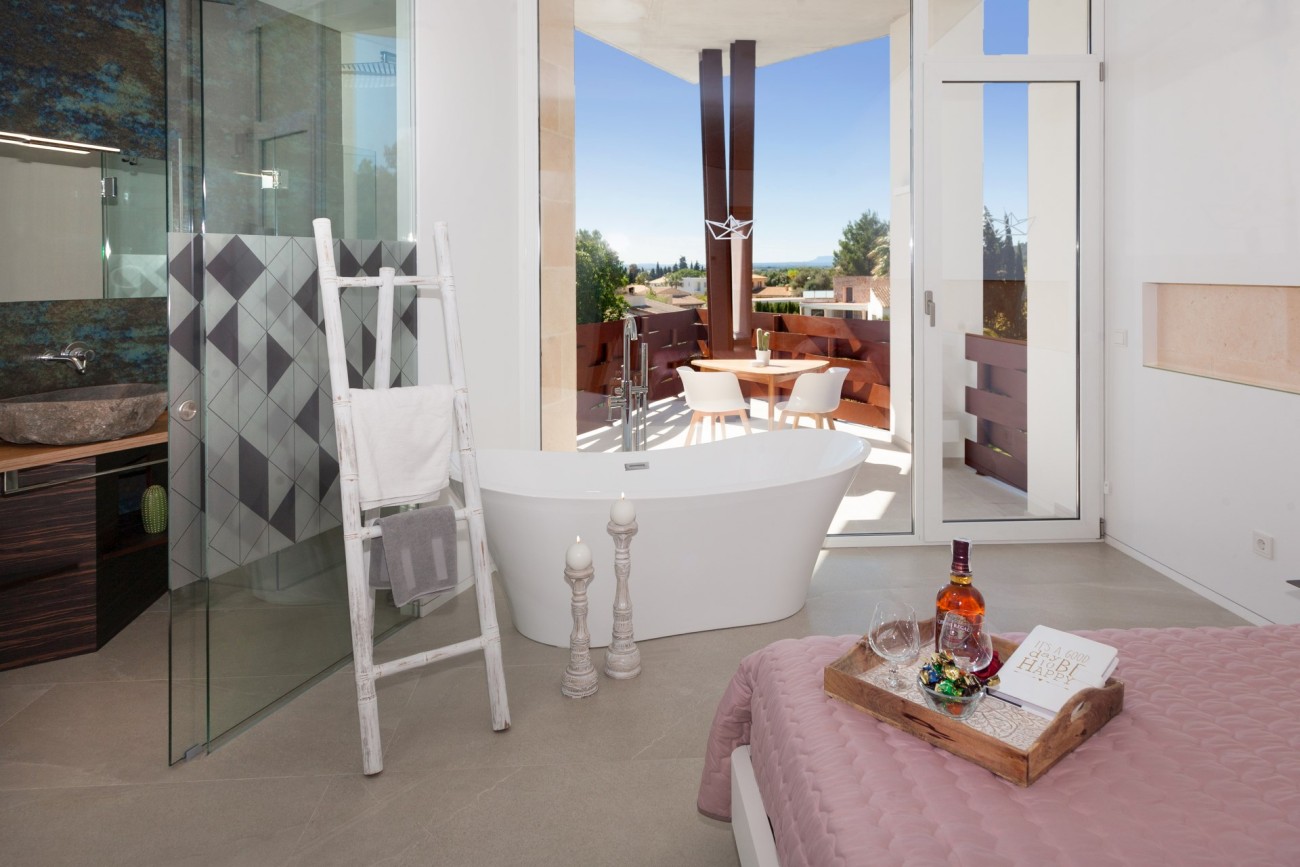De buitenruimte omvat een spectaculair verwarmd zoutwaterzwembad en voldoende ruimte om te ontspannen of te entertainen onder de mediterrane zon. Het hele jaar door is het klimaat comfortabel met vloerverwarming, behalve in de kelder, en energiezuinige aerothermische airconditioning in het hele pand.