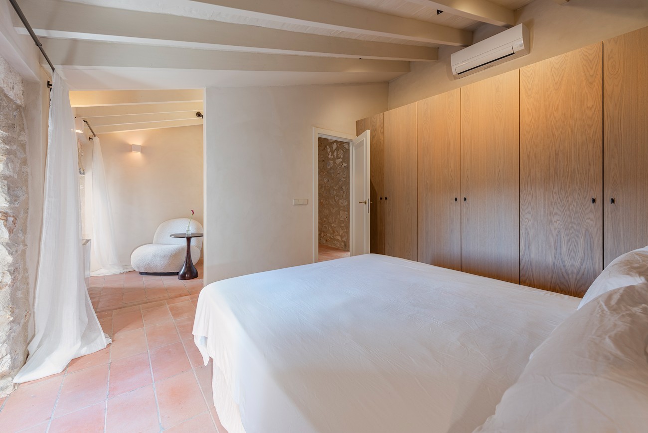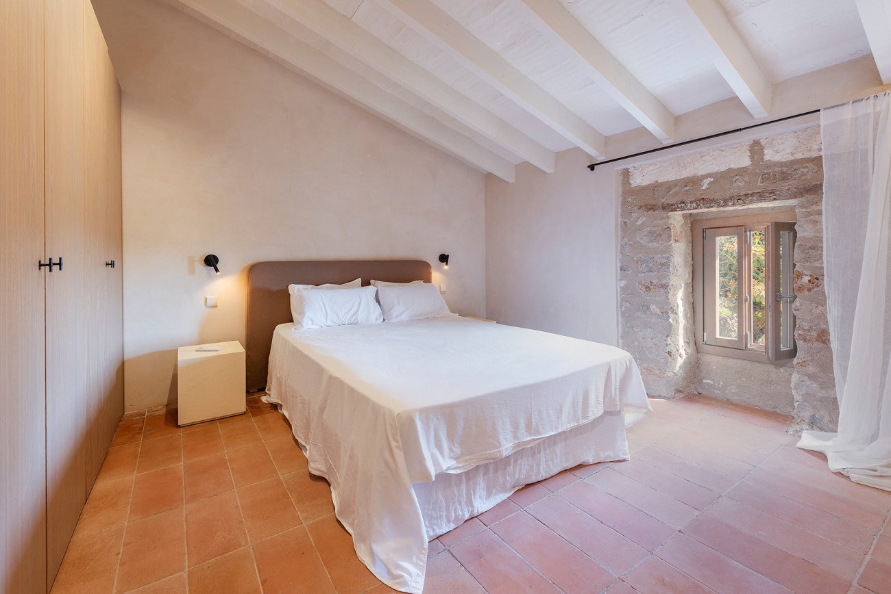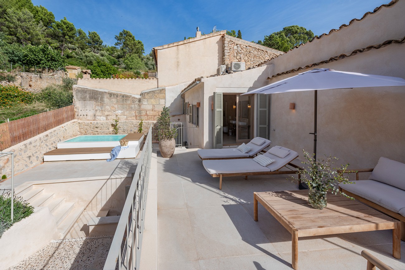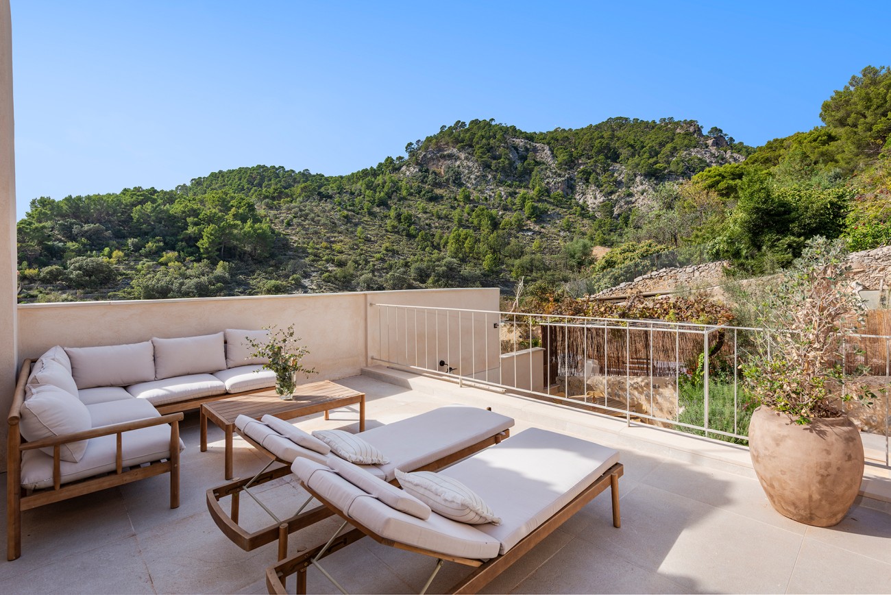Boven delen twee extra slaapkamers een royale badkamer en een stijlvolle inloopkast. Het bovenste terras, met directe toegang tot het zwembad, biedt een prachtig uitzicht op de Serra de Tramuntana en creëert een serene achtergrond voor een kopje koffie in de ochtend of een avond met zonsondergang.