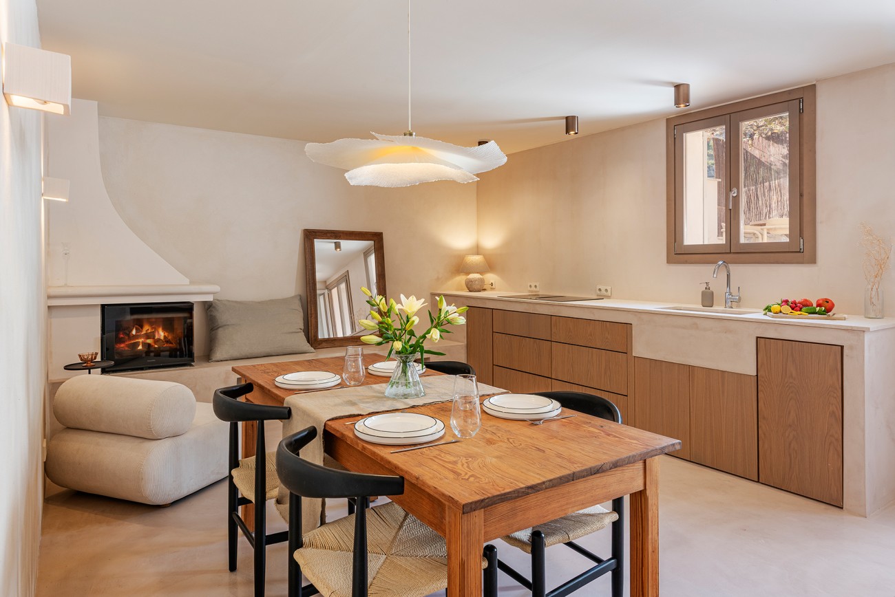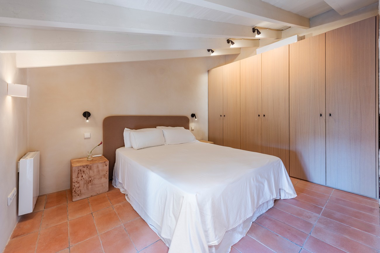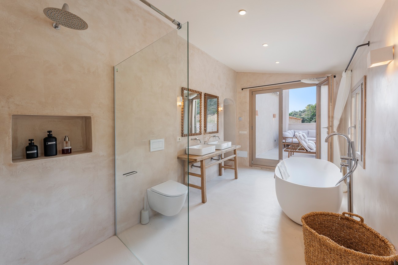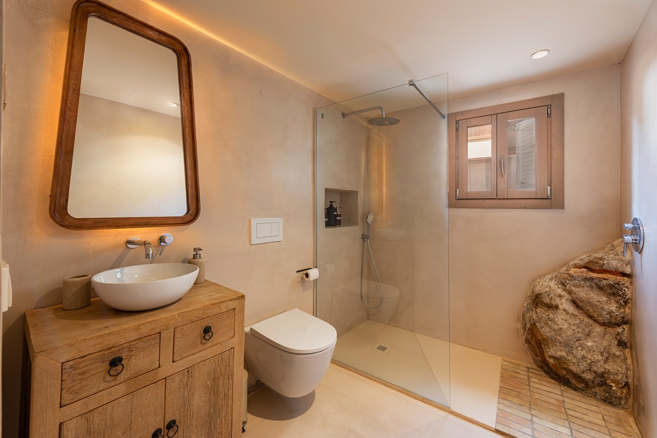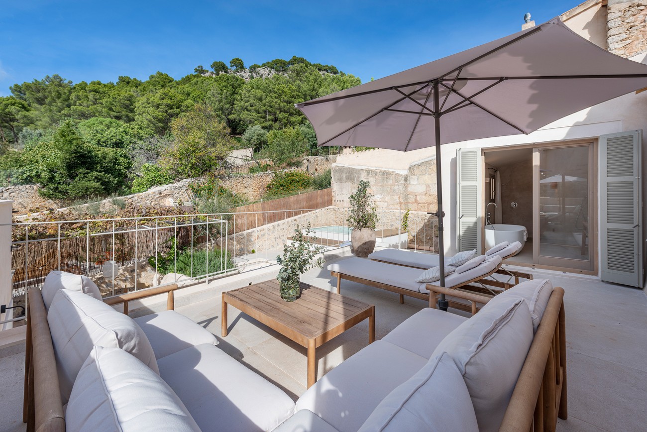 Boven delen twee extra slaapkamers een royale badkamer en een stijlvolle inloopkast. Het bovenste terras, met directe toegang tot het zwembad, biedt een prachtig uitzicht op de Serra de Tramuntana en creëert een serene achtergrond voor een kopje koffie in de ochtend of een avond met zonsondergang.