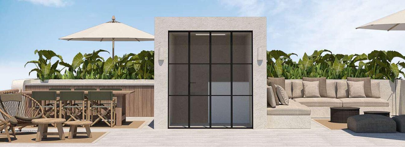 Each home for sale is spread over two floors and features generous outdoor spaces, including terraces and a rooftop solarium with beautiful sea views. Most properties include a private garden-patio with pool and garage. Every residence offers three double bedrooms, three full bathrooms, and a guest powder room.