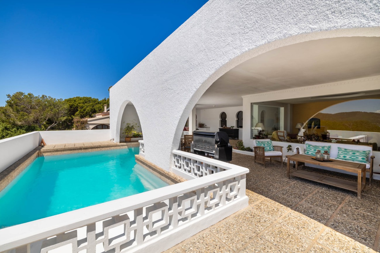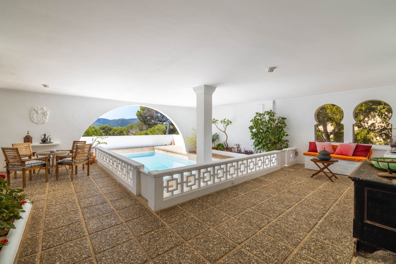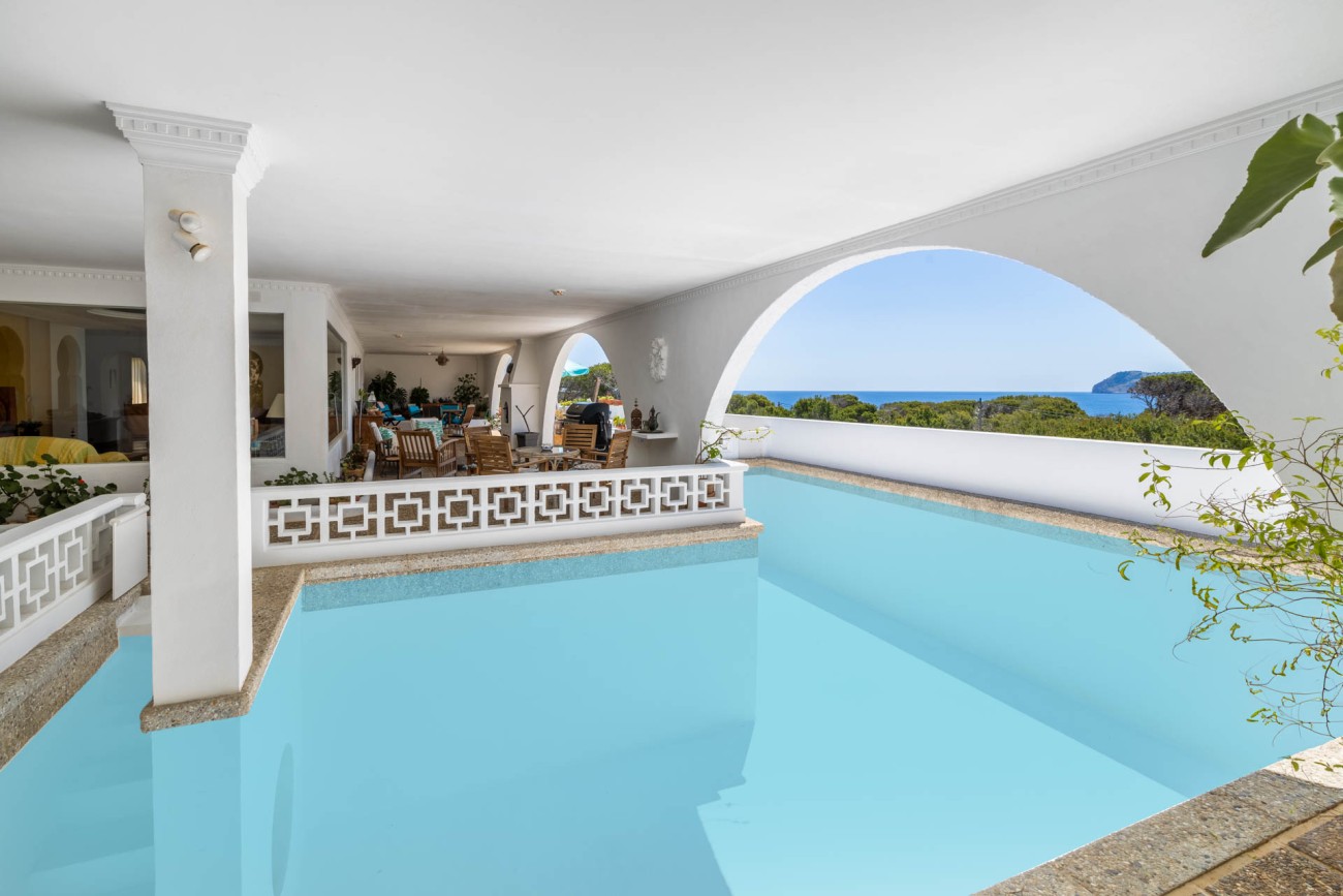 Het huis strekt zich uit over meerdere verdiepingen en biedt een verscheidenheid aan zitgedeeltes binnen en buiten, waaronder zonovergoten terrassen en overdekte ruimtes waar je het hele jaar door van kunt genieten. Een echt hoogtepunt is het unieke zwembad, slim geïntegreerd in het hoofdterras. Afgescheiden door een zitgedeelte en gedeeltelijk in de schaduw onder gewelfde stenen, biedt het een magische omgeving om te ontspannen terwijl je uitkijkt over de zee.