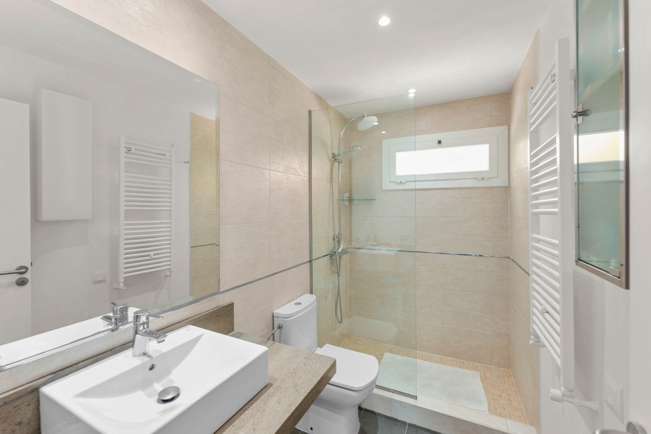 Buiten beschikt de woning over vier privéparkeerplaatsen, een dubbele ondergrondse garage, een privézwembad en directe toegang tot een bospad dat naar Paguera leidt, ideaal om te wandelen of te fietsen.