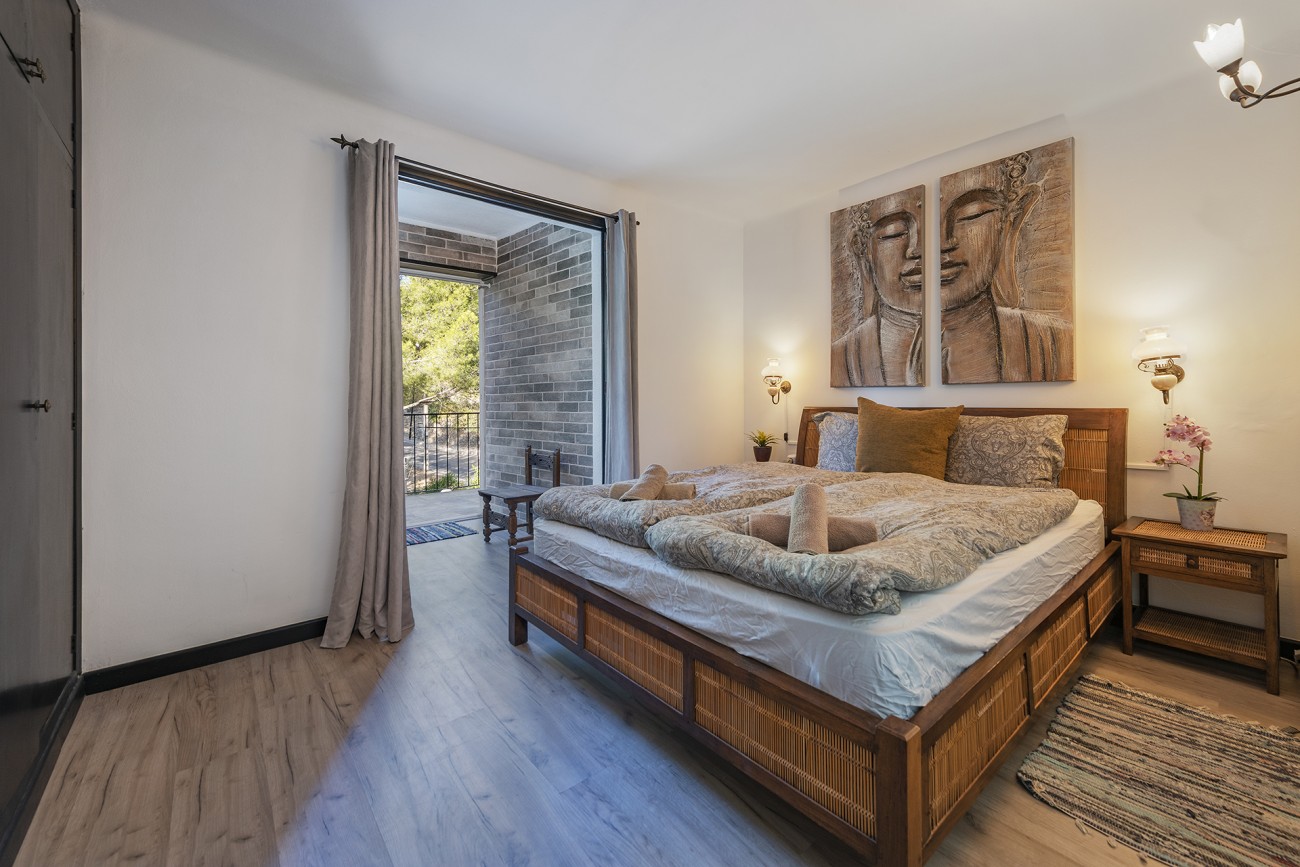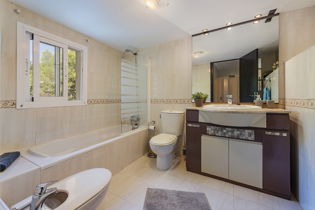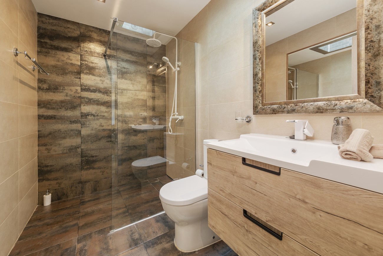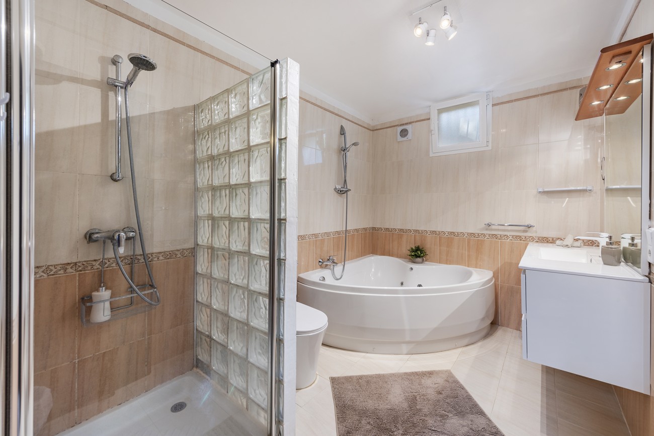 Je kunt de villa bereiken via twee ingangen. De bovenste verdieping bevat de belangrijkste leefruimte met een open en moderne keuken met een groot “eiland” en geïntegreerde apparatuur en vanuit de eethoek kun je genieten van prachtig uitzicht op zee door de grote ramen. De woonkamer heeft een mooie open haard en een raam met uitzicht op het zwembad. Op de benedenverdieping bevinden zich drie slaapkamers, drie badkamers en toegang tot het lager gelegen terras.