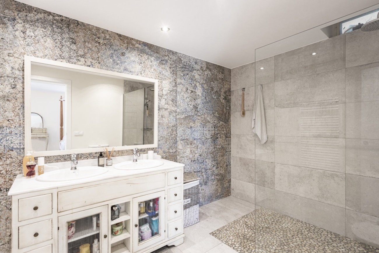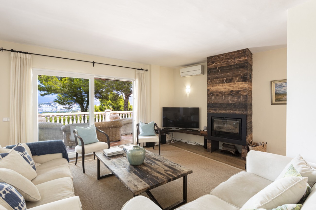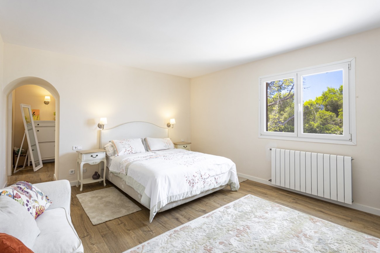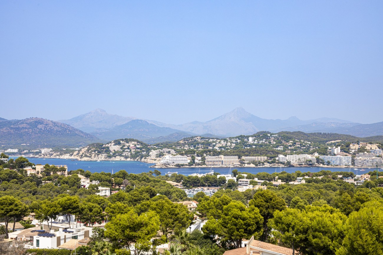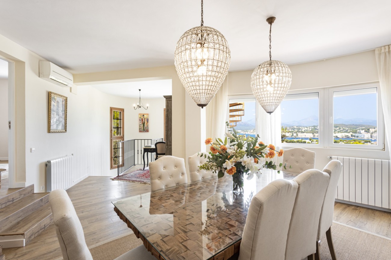 Deze twee verdiepingen tellende villa heeft een bebouwde oppervlakte van ongeveer 352m2 met grote lichte kamers. Je betreedt de woning op de bovenste verdieping, en hier vind je een aantrekkelijke hal die leidt naar een chique, open indeling met een ingerichte keuken, een eethoek en een woonkamer met open haard. Vanaf hier heb je direct toegang tot een terras met veel ruimte voor ontspannende meubels en een prachtig uitzicht op de baai van Santa Ponsa. Deze verdieping heeft ook een tweepersoonsslaapkamer met kleedkamer en eigen badkamer, een gastentoilet en een kleine extra kamer die ideaal zou zijn als kantoor.