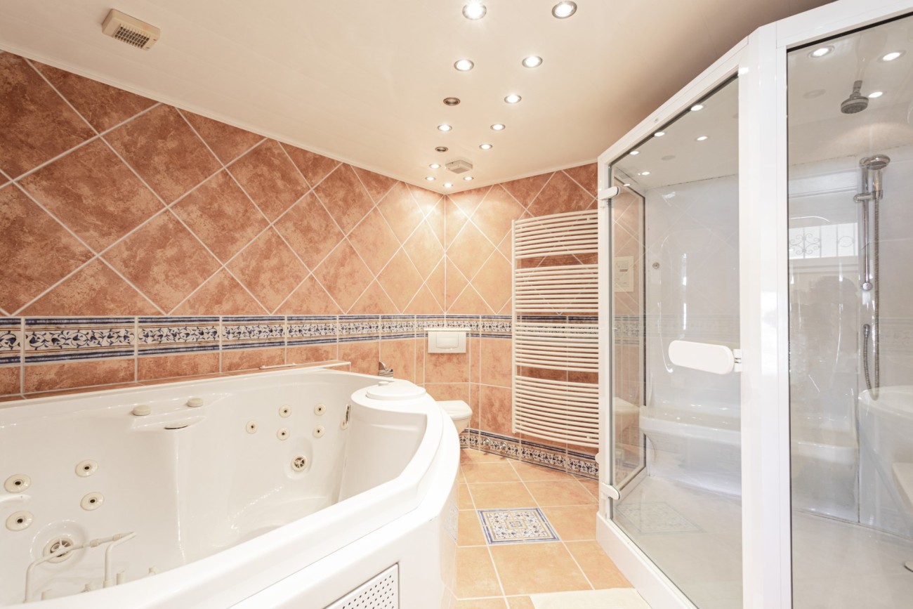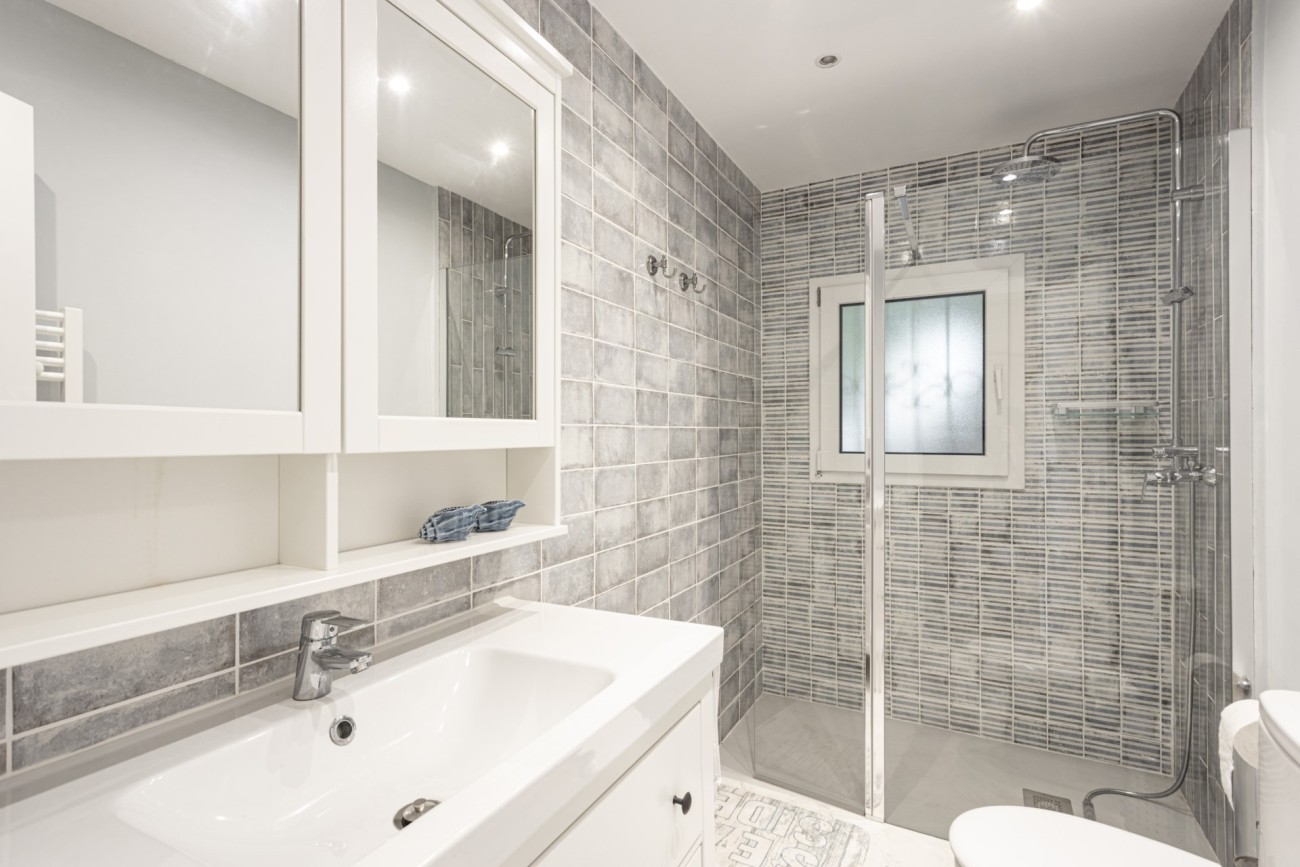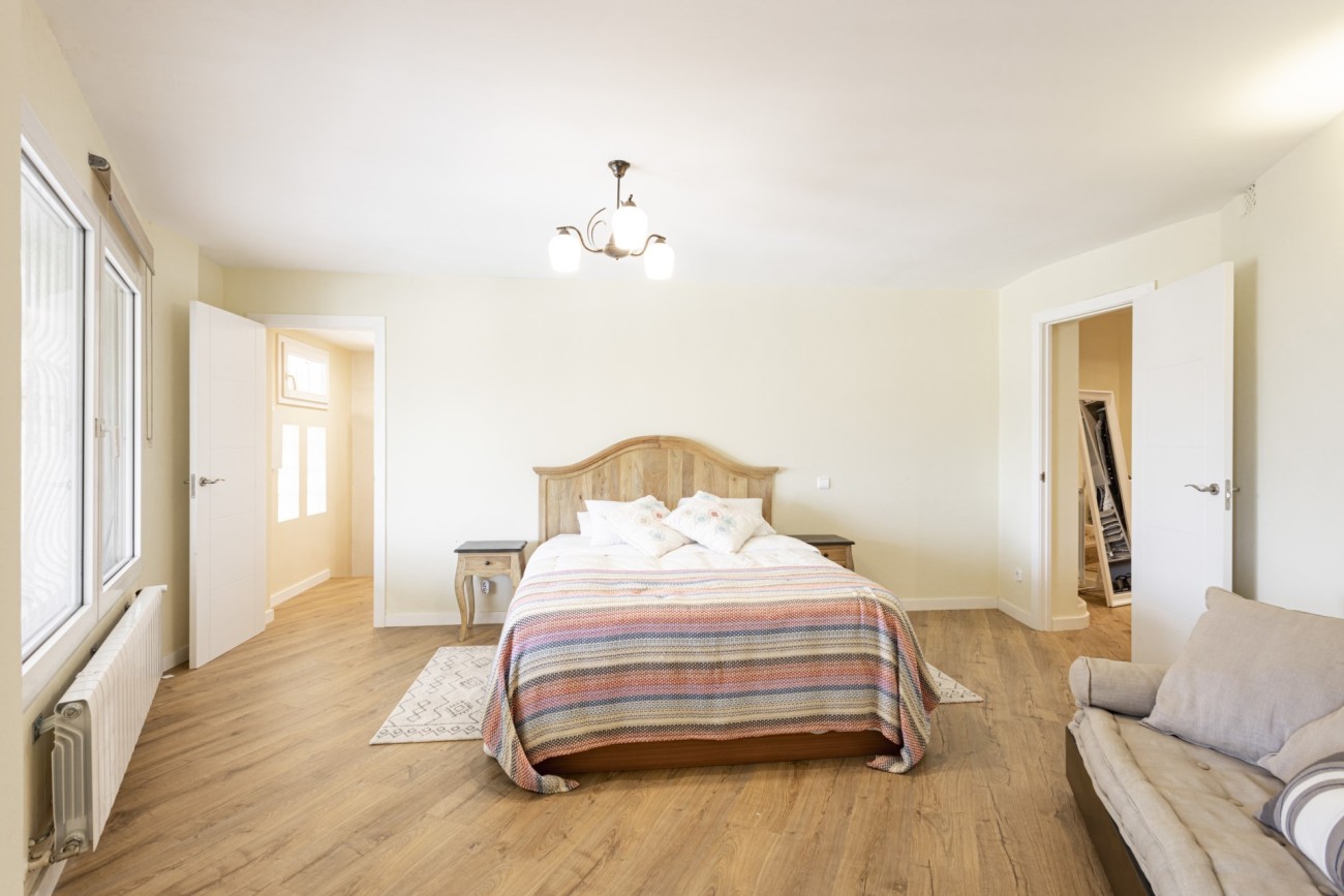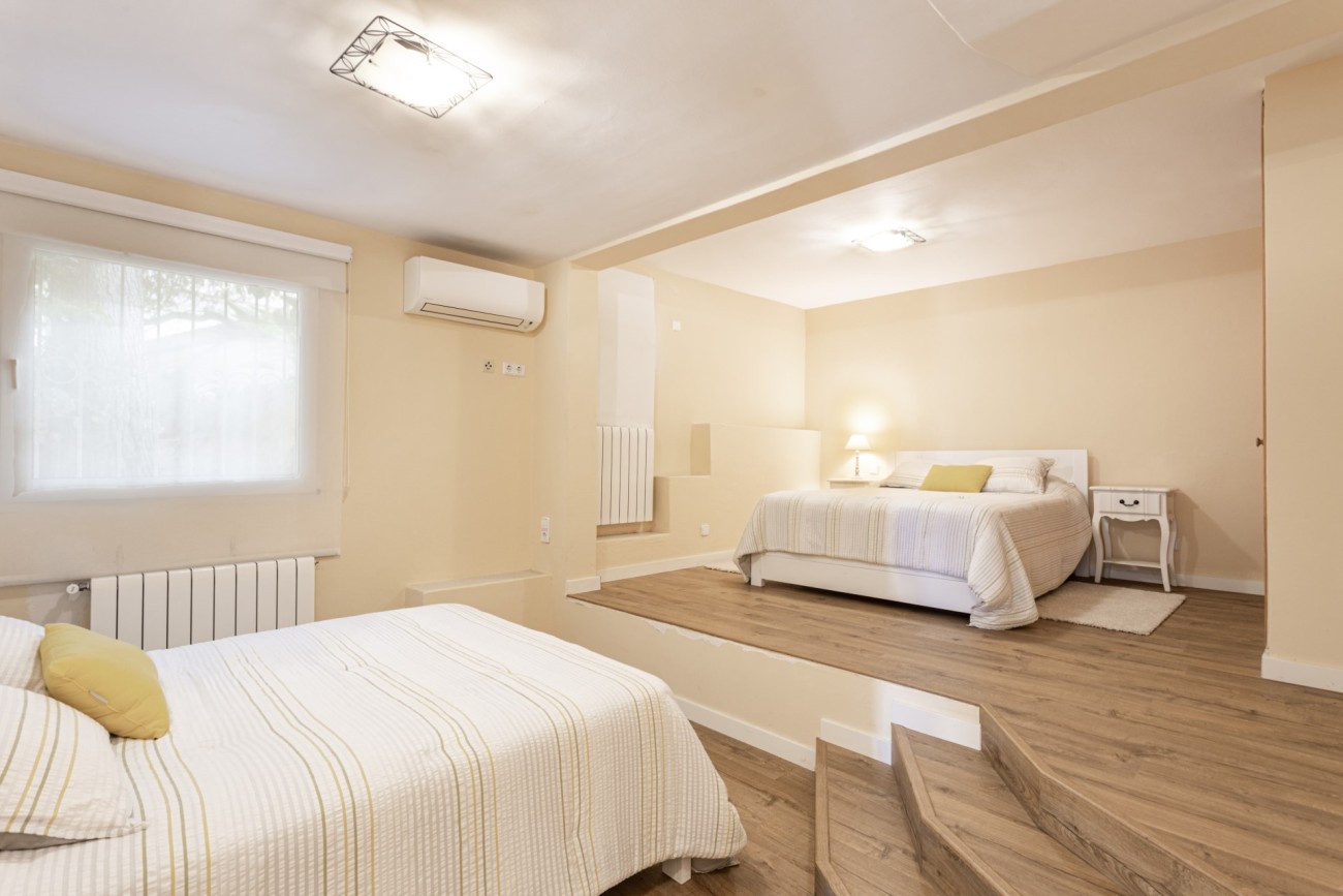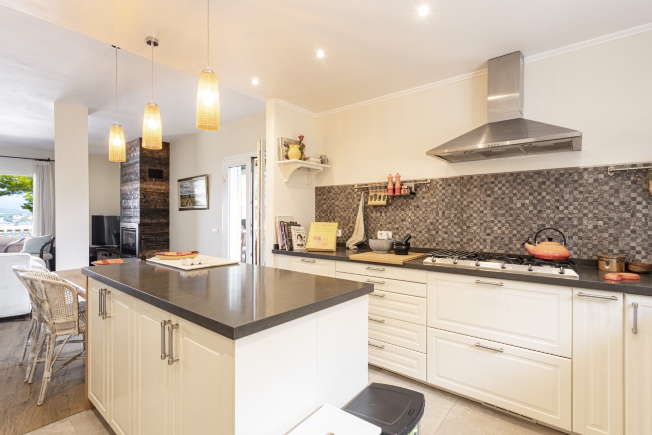 Deze twee verdiepingen tellende villa heeft een bebouwde oppervlakte van ongeveer 352m2 met grote lichte kamers. Je betreedt de woning op de bovenste verdieping, en hier vind je een aantrekkelijke hal die leidt naar een chique, open indeling met een ingerichte keuken, een eethoek en een woonkamer met open haard. Vanaf hier heb je direct toegang tot een terras met veel ruimte voor ontspannende meubels en een prachtig uitzicht op de baai van Santa Ponsa. Deze verdieping heeft ook een tweepersoonsslaapkamer met kleedkamer en eigen badkamer, een gastentoilet en een kleine extra kamer die ideaal zou zijn als kantoor.