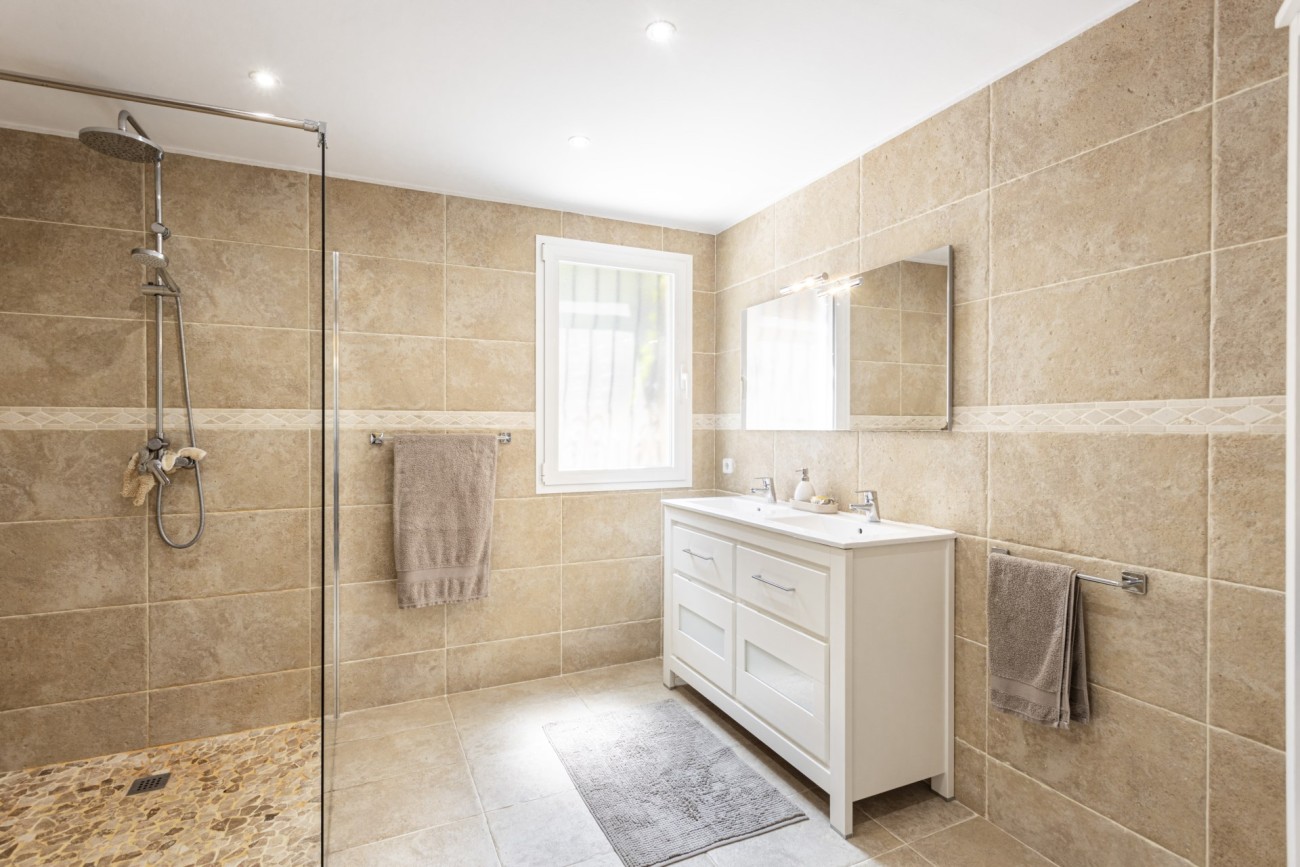 Op het lagere niveau van de villa bevinden zich nog eens drie slaapkamers en drie badkamers, inclusief faciliteiten voor een gastenappartement. Al deze kamers hebben toegang tot een terras met prachtig uitzicht.