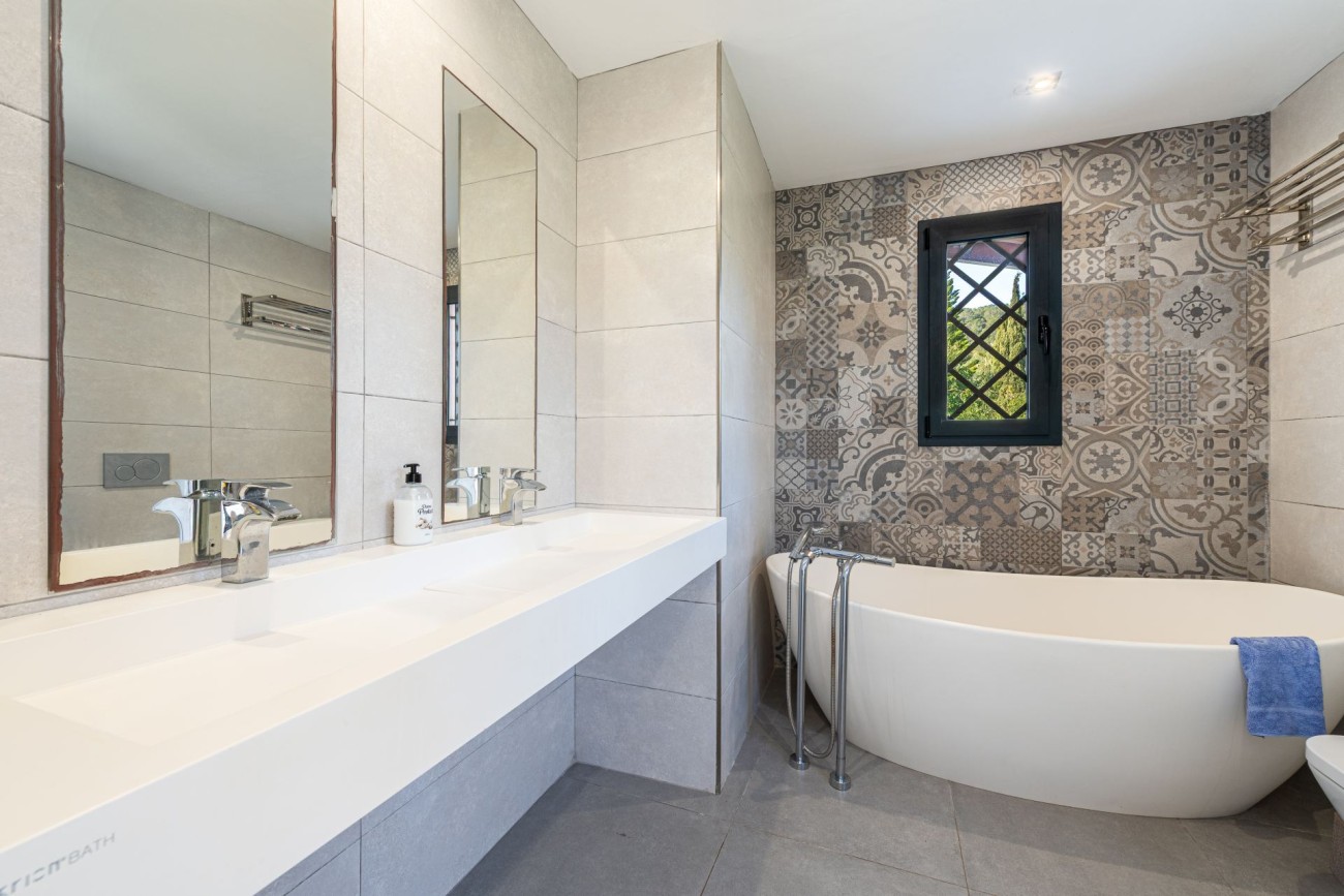 Designed with clean, symmetrical architecture and accessed through a hall located in the heart of the house, the villa features a bright open plan living and dining area with large windows overlooking the garden and pool. A fireplace adds warmth and character, making the space comfortable year-round.