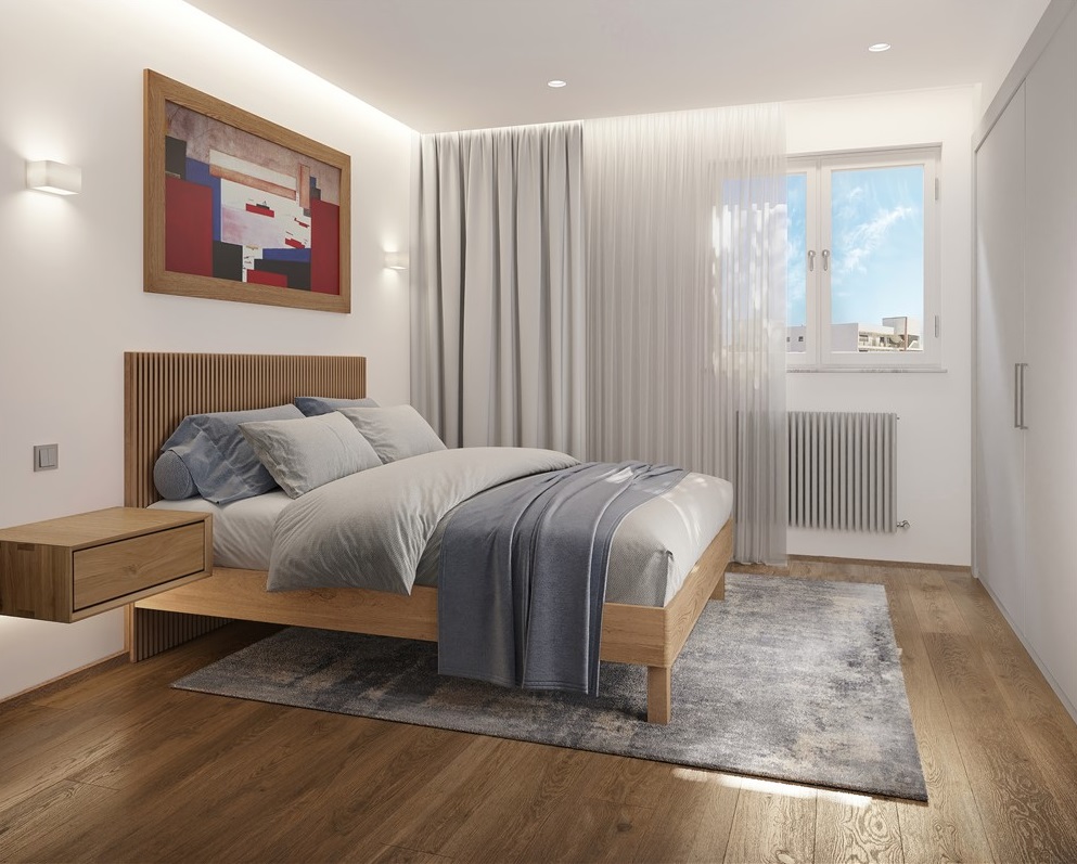 Het appartement, met lift, is ruim 132 m2 en heeft drie royale slaapkamers en twee badkamers. Een van deze slaapkamers is de hoofdslaapkamer met een inloopkast en ensuite badkamer.