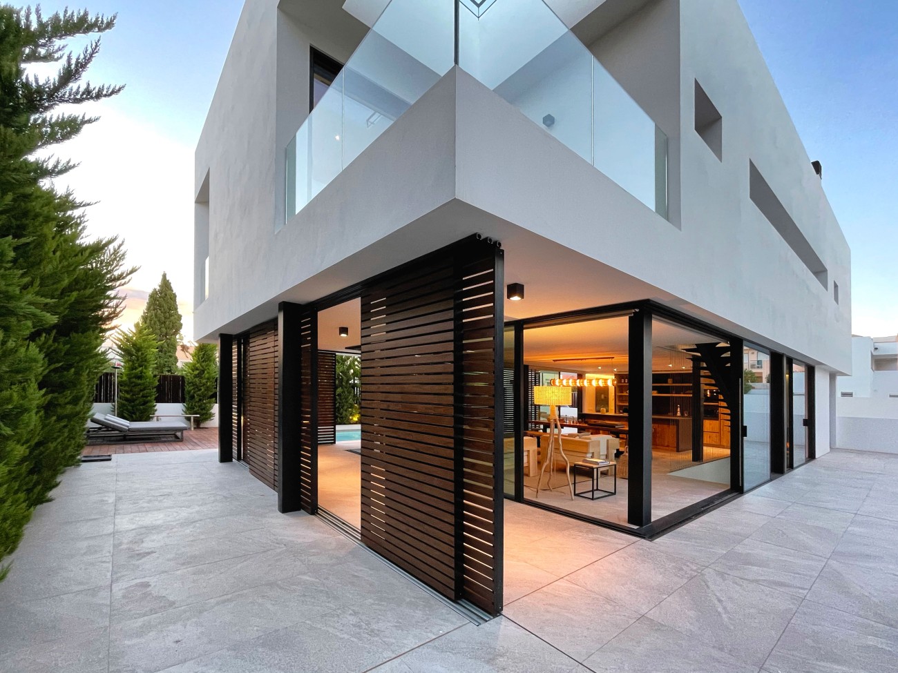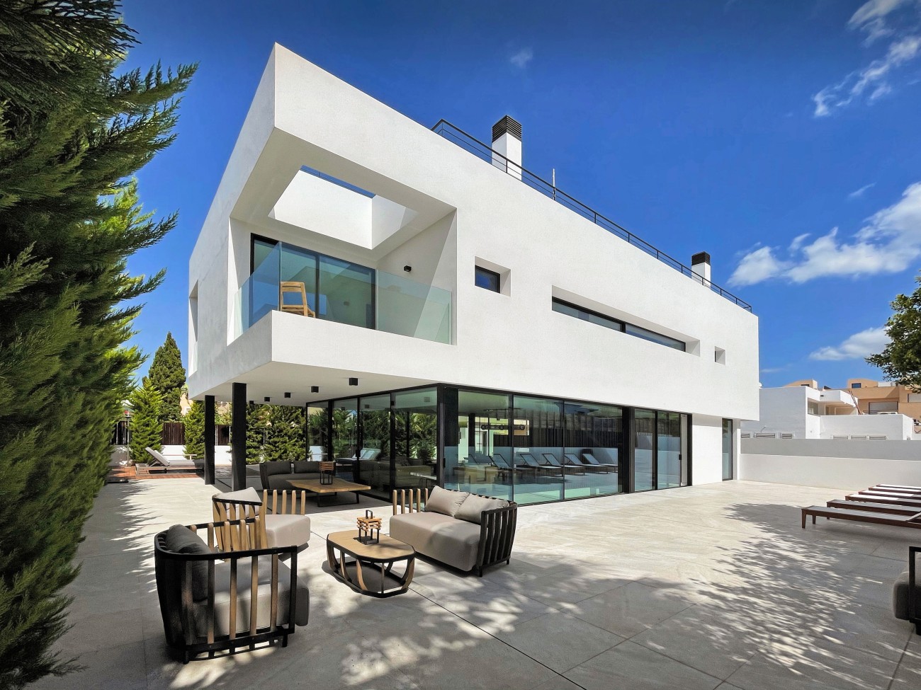Deze prachtige designvilla te koop in Illa Plana – Ibiza, geniet van een bevoorrechte locatie op slechts enkele minuten van de jachthaven en het gouden zand van Talamanca Beach.